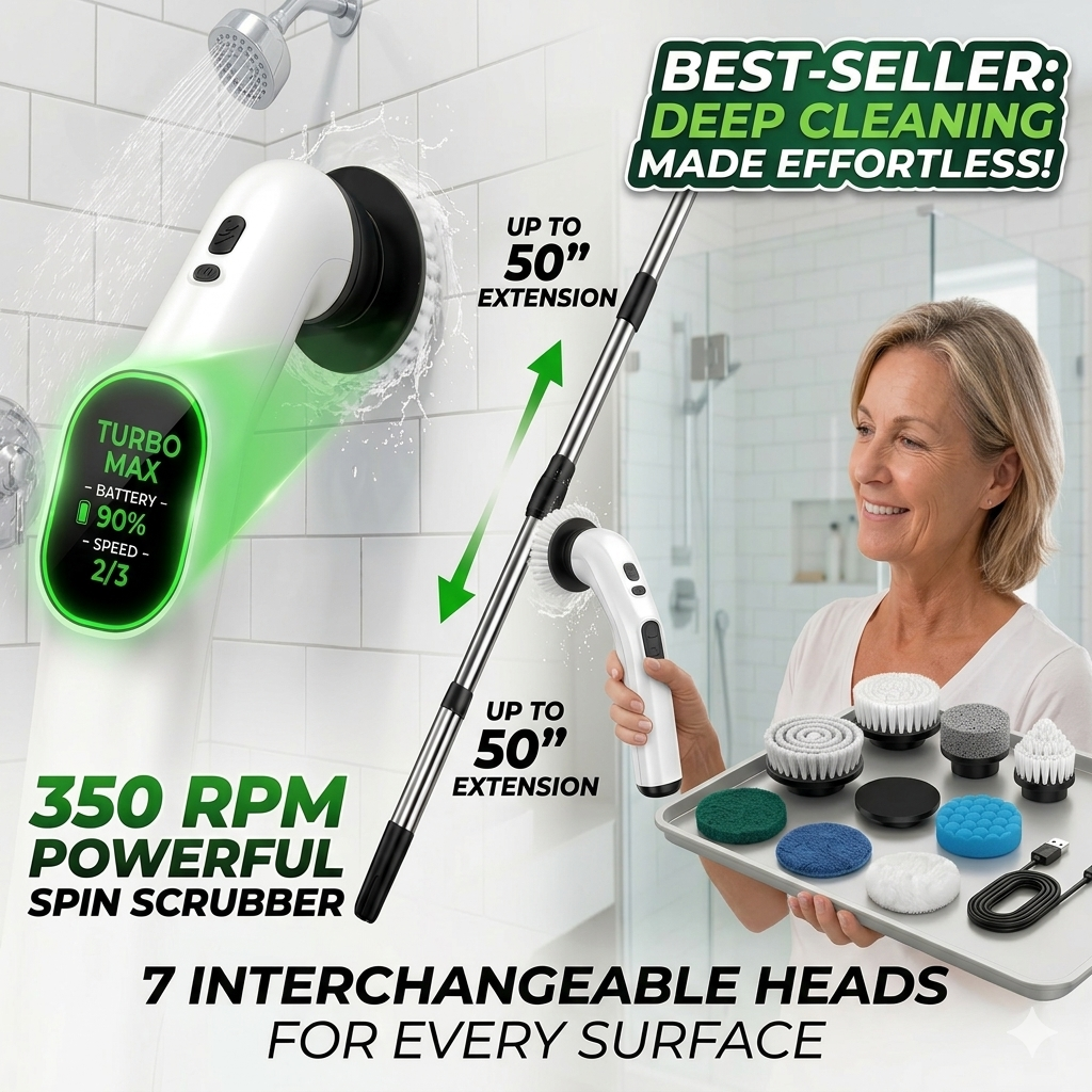 The 350 RPM electric spin scrubber with extendable handle makes cleaning bathrooms, tiles, and hard-to-reach areas faster and easier than ever.