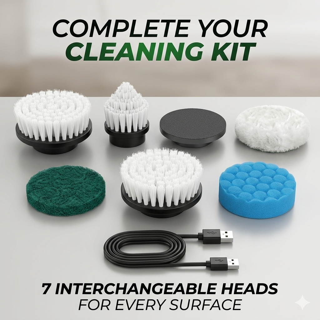 With a 7-in-1 design, this electric spin scrubber cleans a wide range of surfaces such as bathtubs, floors, washing machines, glass, etc., and is equipped with a variety of brush heads and attachments
